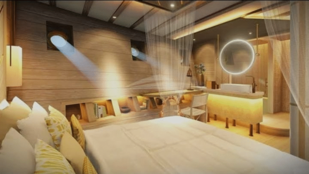 - Solar-powered systems and modern battery technology to reduce emissions, minimize noise, and offer silent nights aboard.
